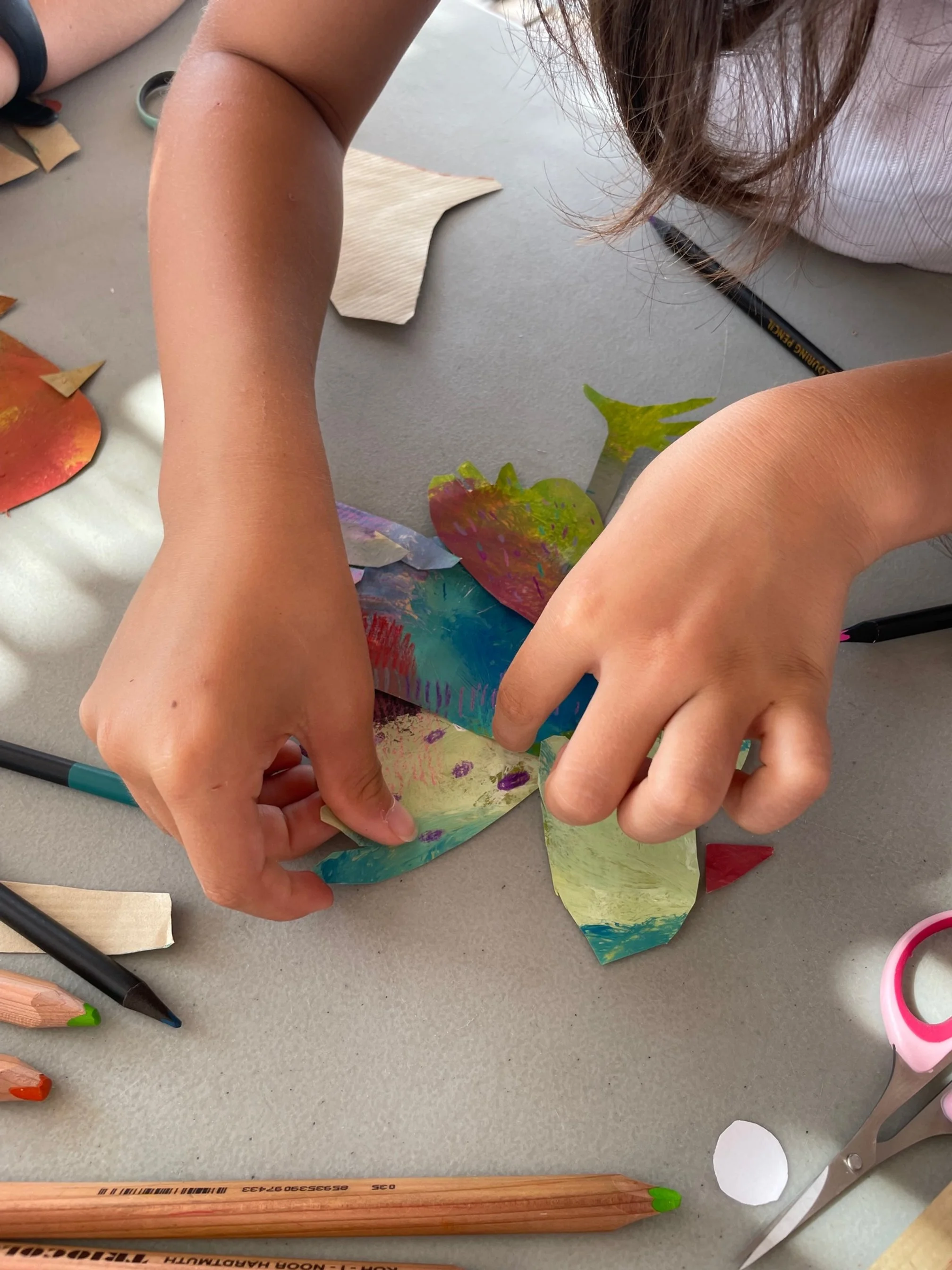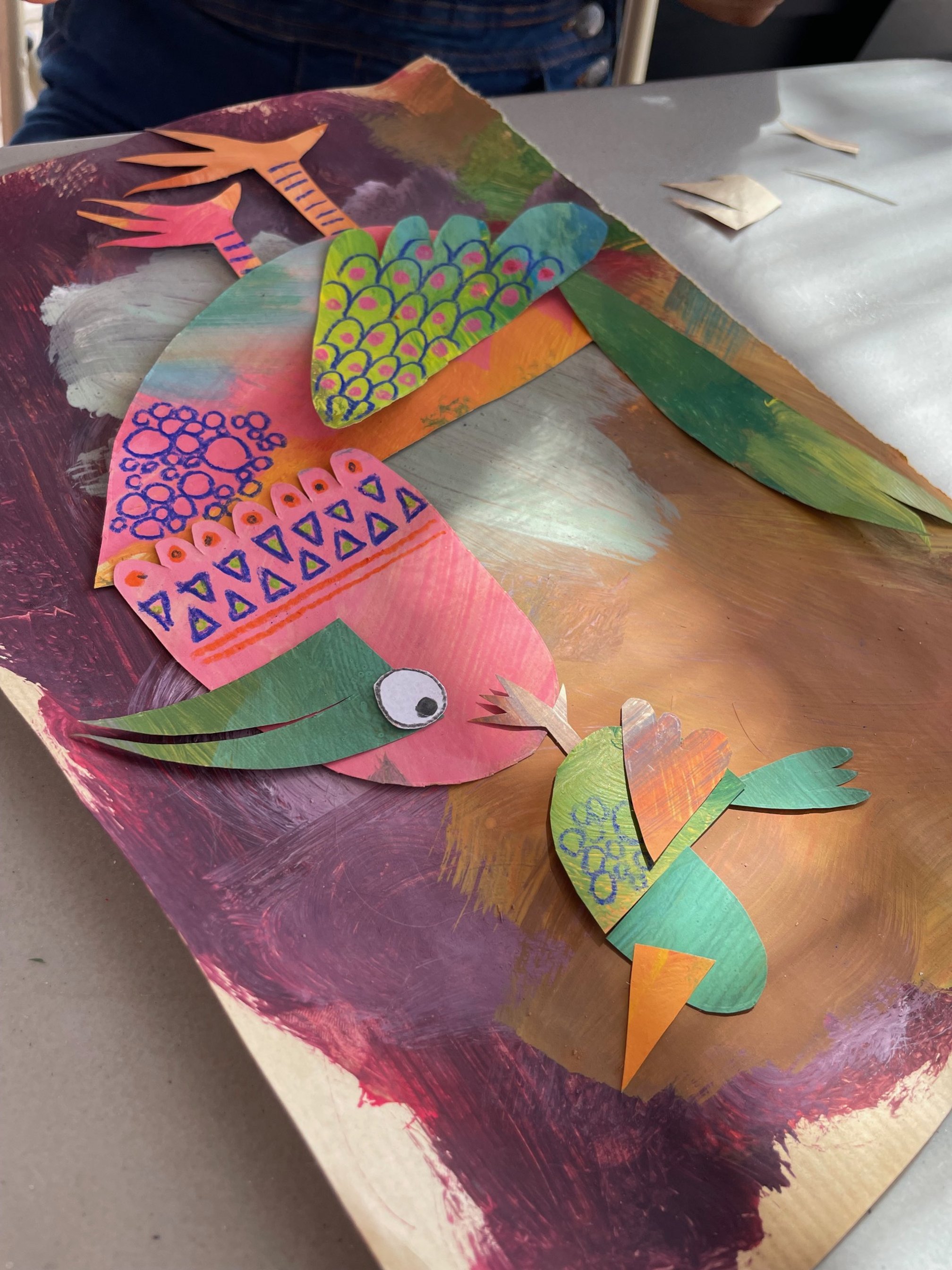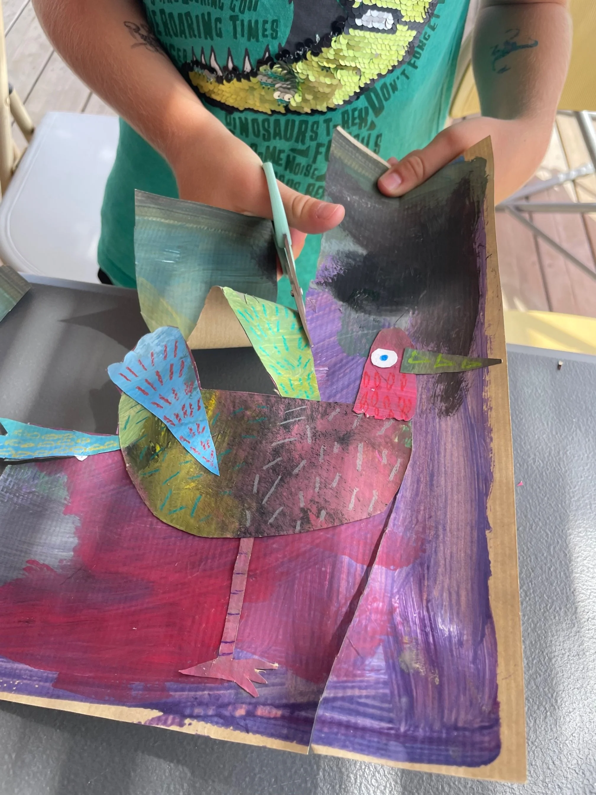 Apprend à composer ton oiseau en papier découpé sur un papier gouaché.