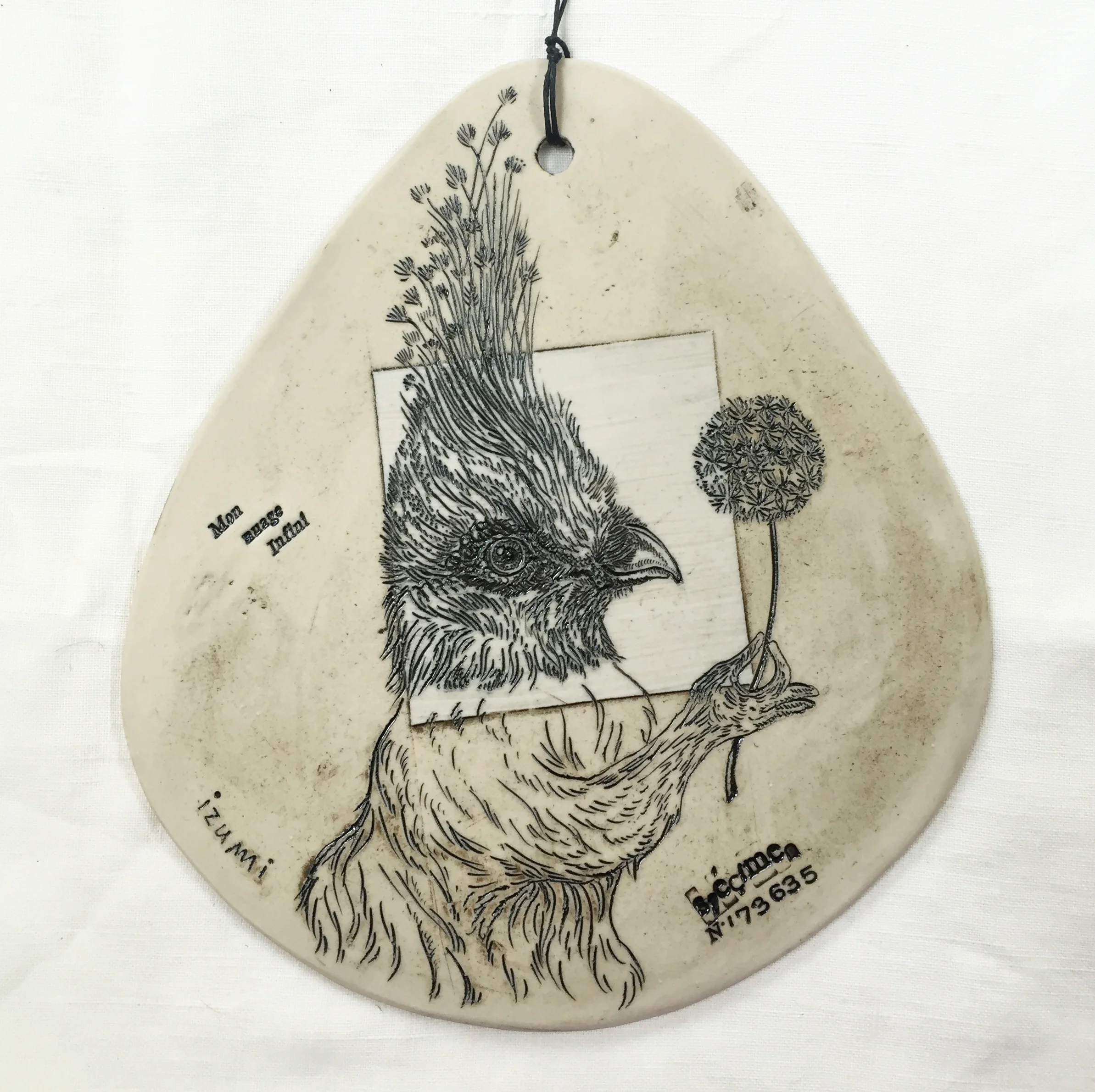 Un dessin original, gravé sur une plaque de céramique façonnée et illustrée par Izumi.