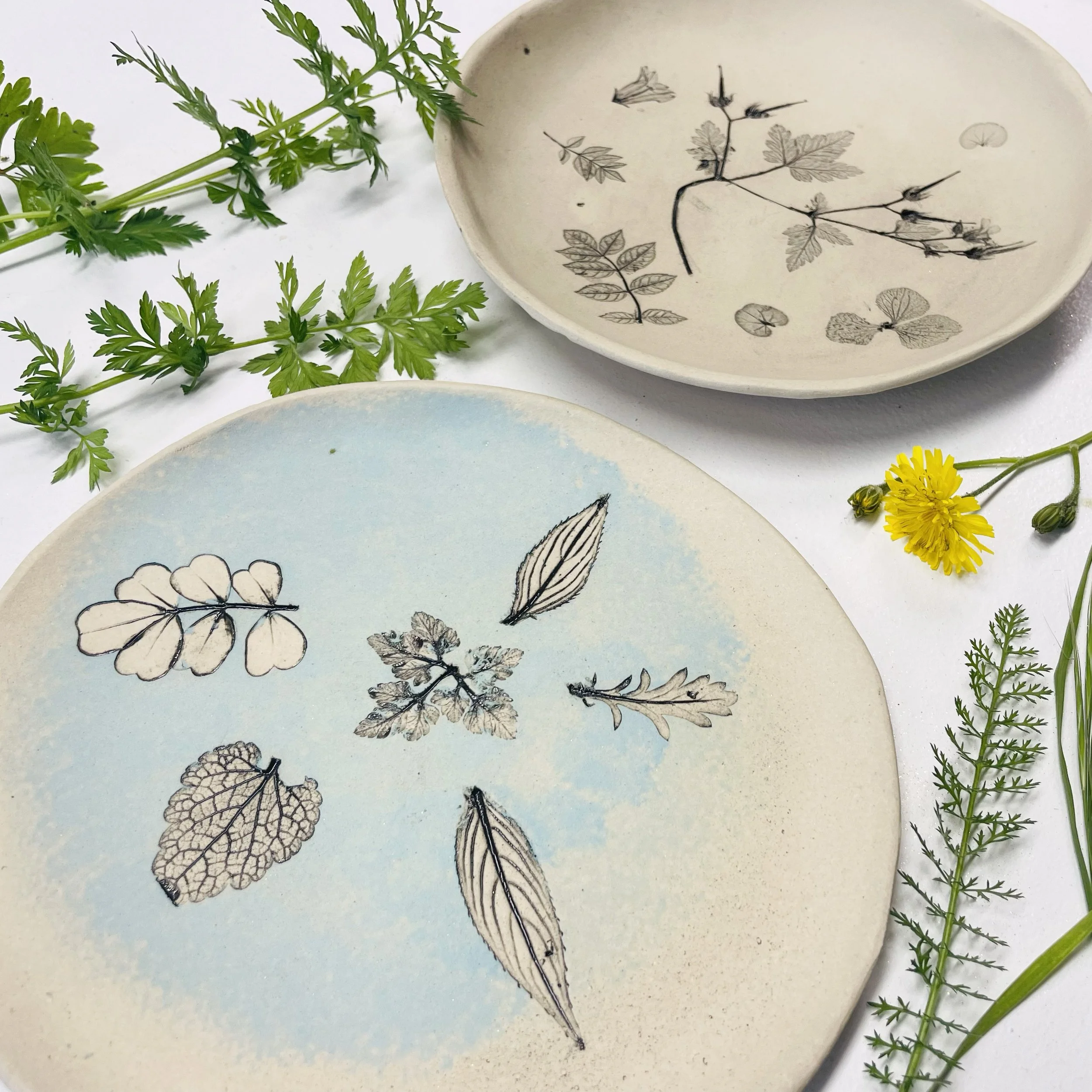 Créez votre duo d'assiettes en grès blanc et après une petite balade, vous pourrez composer dans la terre le relief de vos plantes préférées !